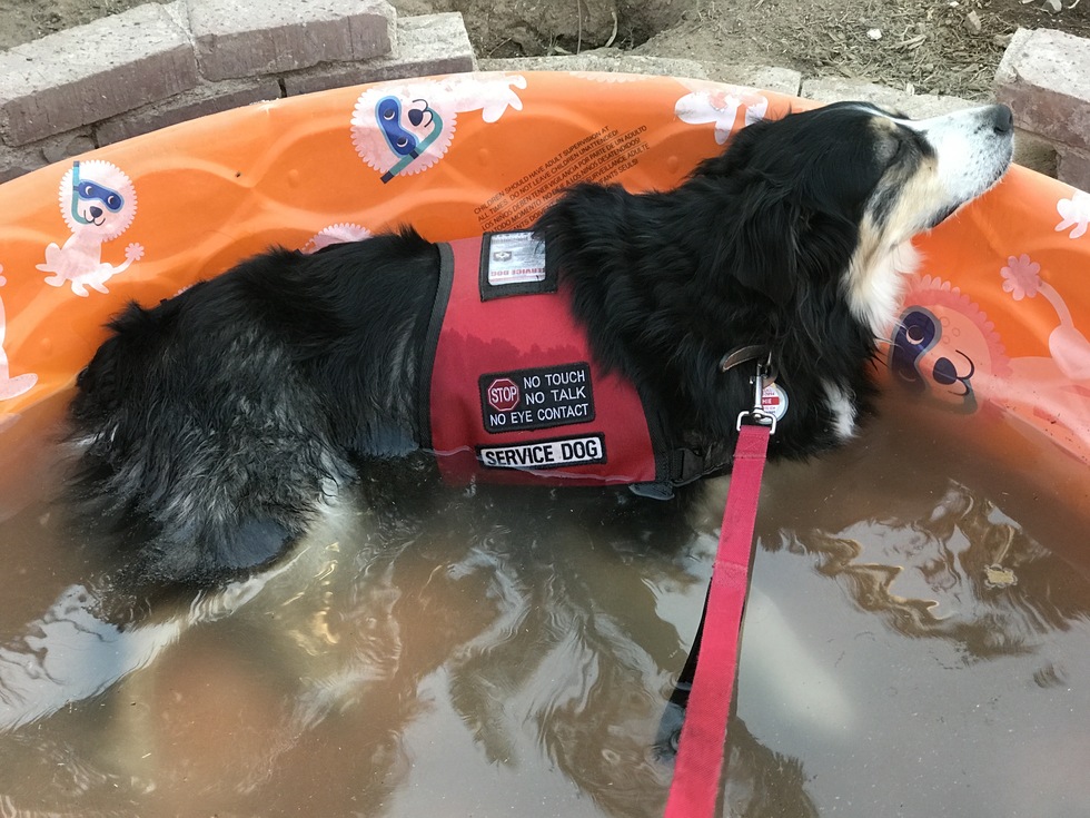 Sophie is a small Australian Shepherd. She’s 8 years old and is my Service Dog. She does Hearing assistance and medical alerts for me, including for seizures and high and low blood sugar.