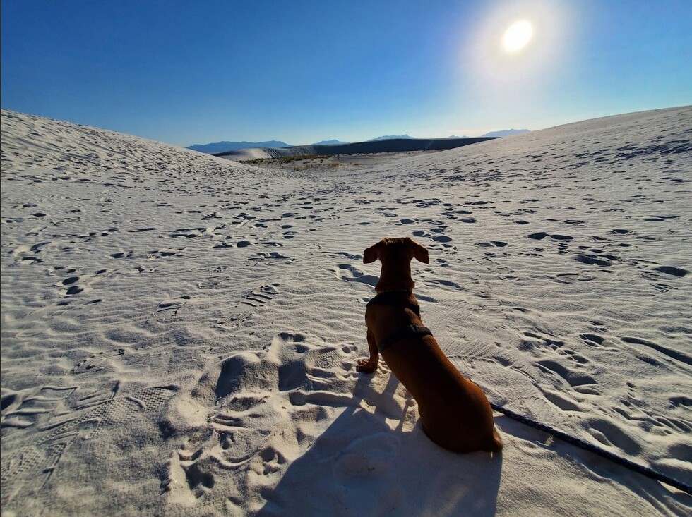 Rescued at the age of one, Mini-Penny loves her adopted mom! Together they travel the country, stopping at every quirky roadside adventure. Mini-Penny is pictured here at White Sands, NM, where she enjoyed running through the dunes and basking in the sun.