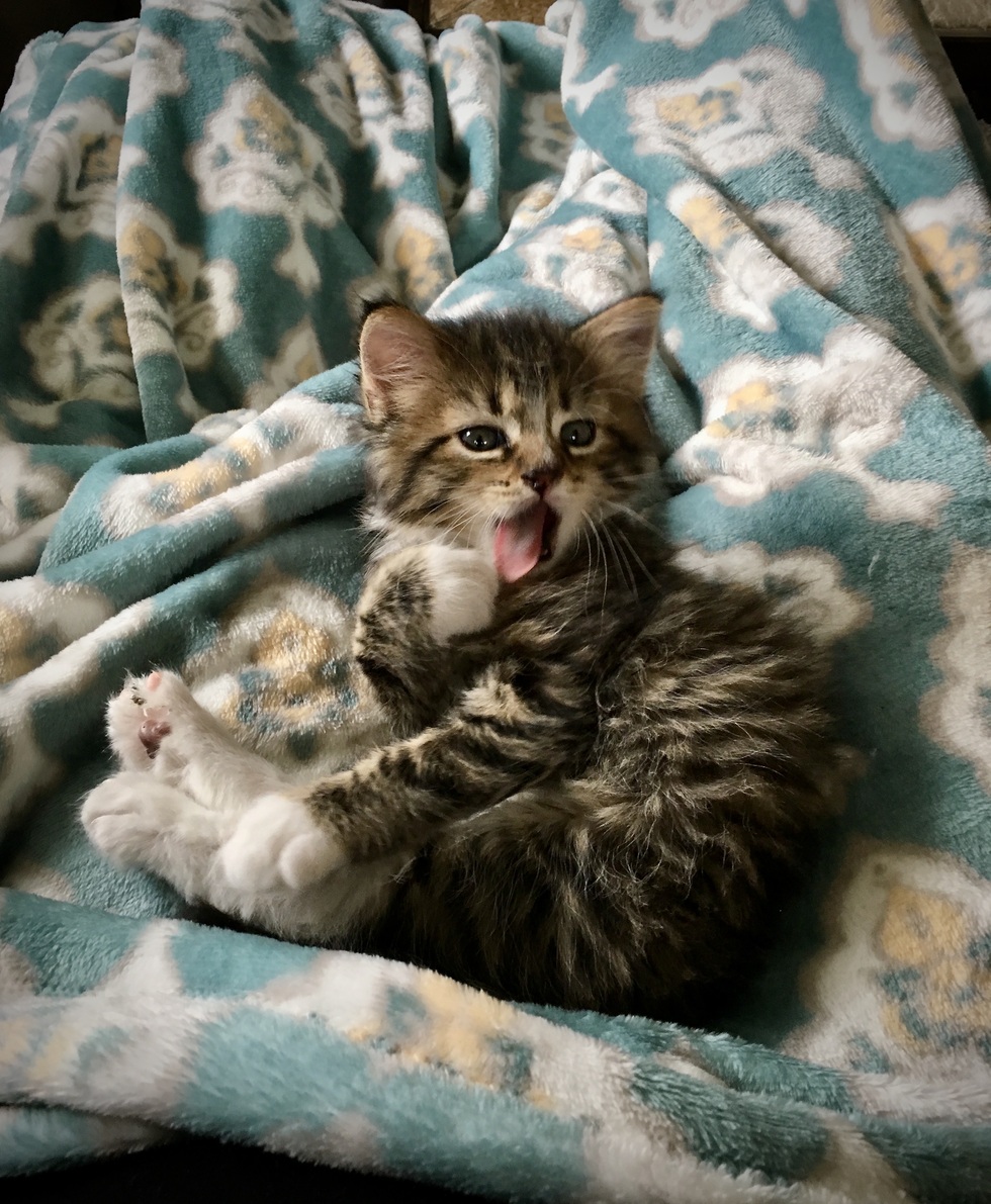We were looking for a companion kitty for our Tabby Stormy when we were introduced to this little bundle of fur from our cousin in Delaware. She did become a companion kitty, but for my husband and they are as thick as thieves together.