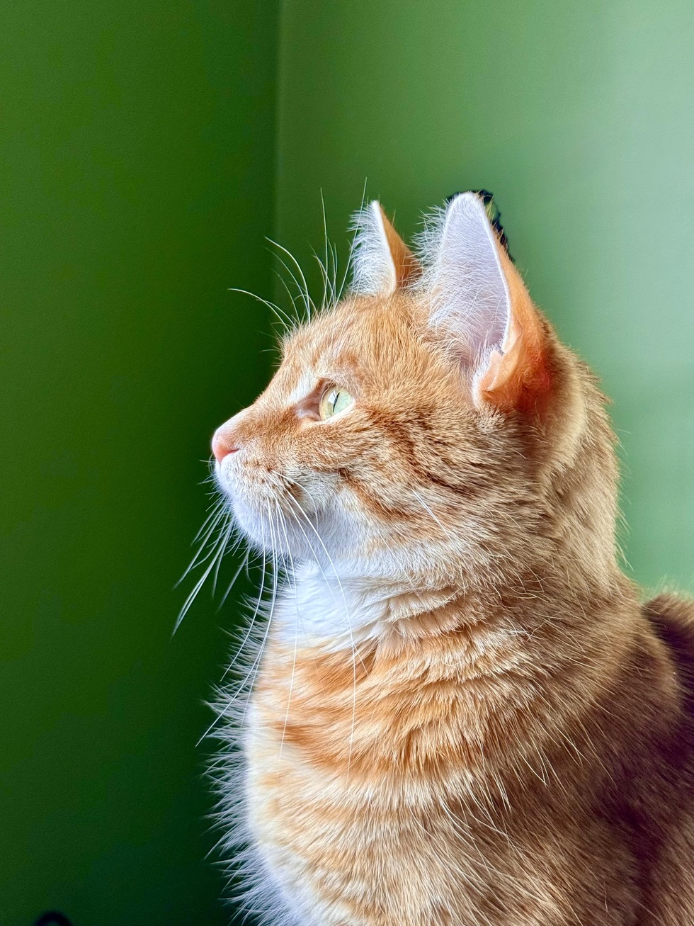 Loves springs and “play fighting” with his new little sister Livi. His “cat dad” is his human, mom is the spare.