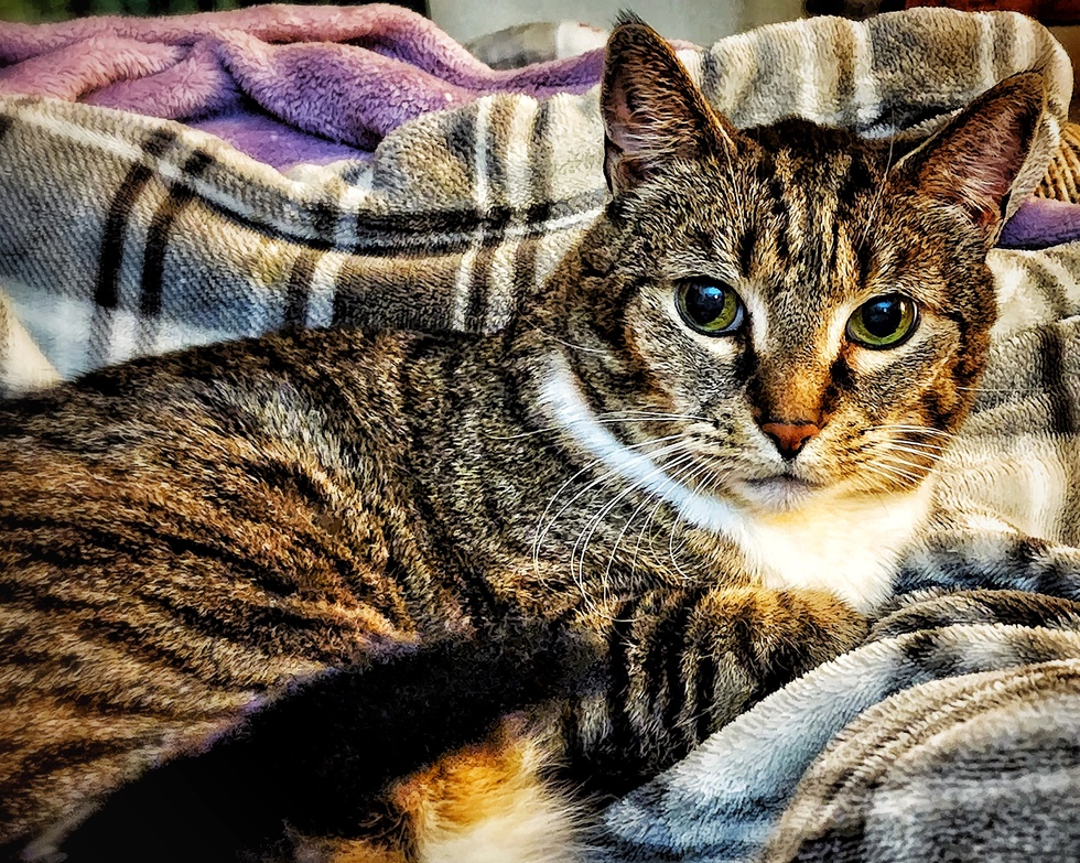 When Sophie came to FLR, my husband was instantly drawn to her good looks, and since we had agreed to adopt a senior cat, she was perfect. We had to wait until she went through her vet visit and socialization with a foster, but after a successful visit, she came home with us. This beautiful girl is now 17 years old and an important member of our family.