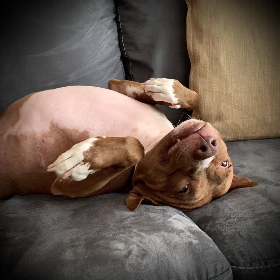 I’m Tottie. I’m an Amstaff/Pit mix with big floppy ears and white socks. I think I’m about 4 years old. I love nothing more than a brand new toy. Sometimes I pick them out myself at the pet store. Sometimes I find a treasure at the park and then race back home to make it mine and destroy it as fast as possible. I love squirrels, butt scratches, and sleeping under the blanket in between mommy and daddy. They say I have the softest belly you’ve ever seen and my smile is infectious.