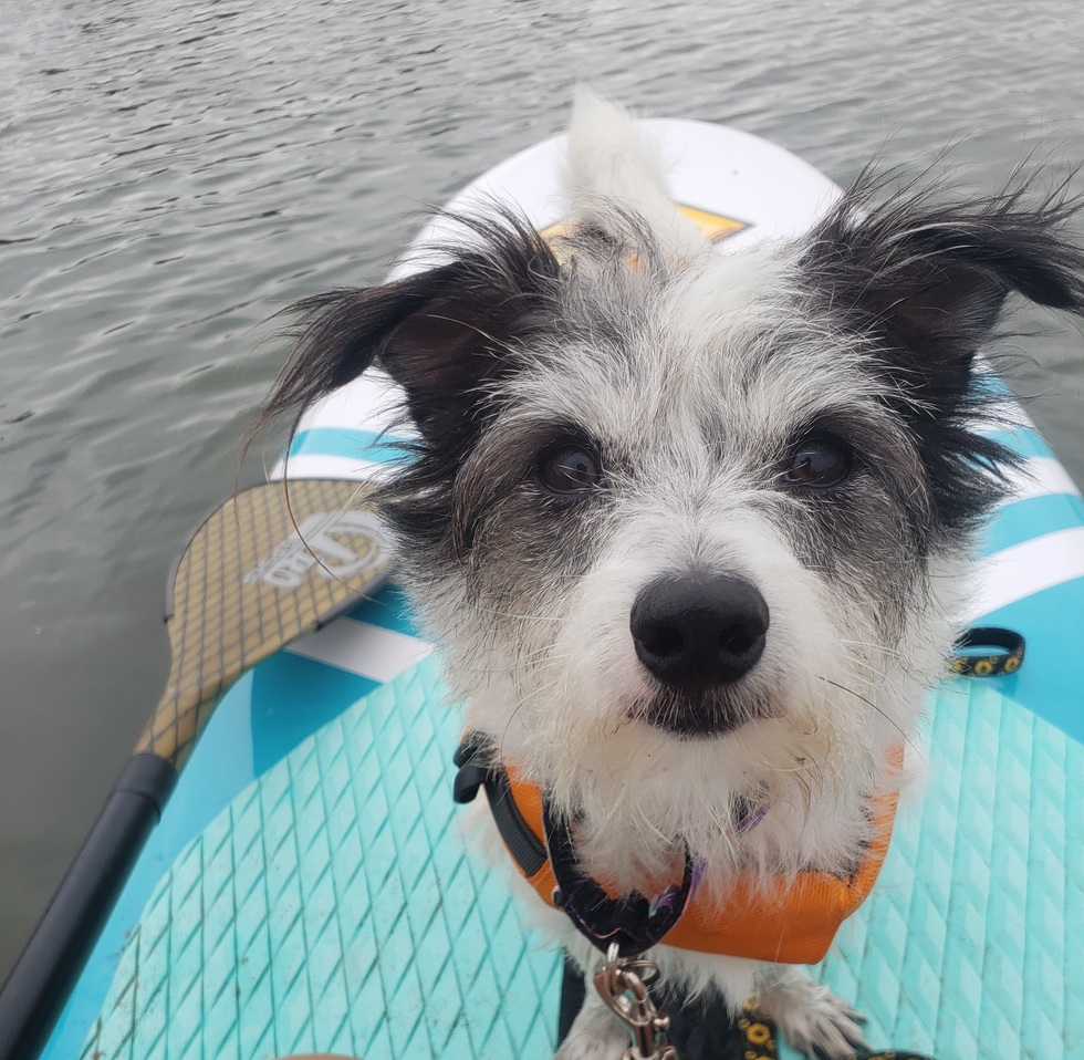 We adopted Stuart from the West LA pound in March 2018. He's the best boy. Stuart enjoys wearing pajamas, riding on the paddle board with his mom, and checking anyone and everyone for snacks (especially strangers).
