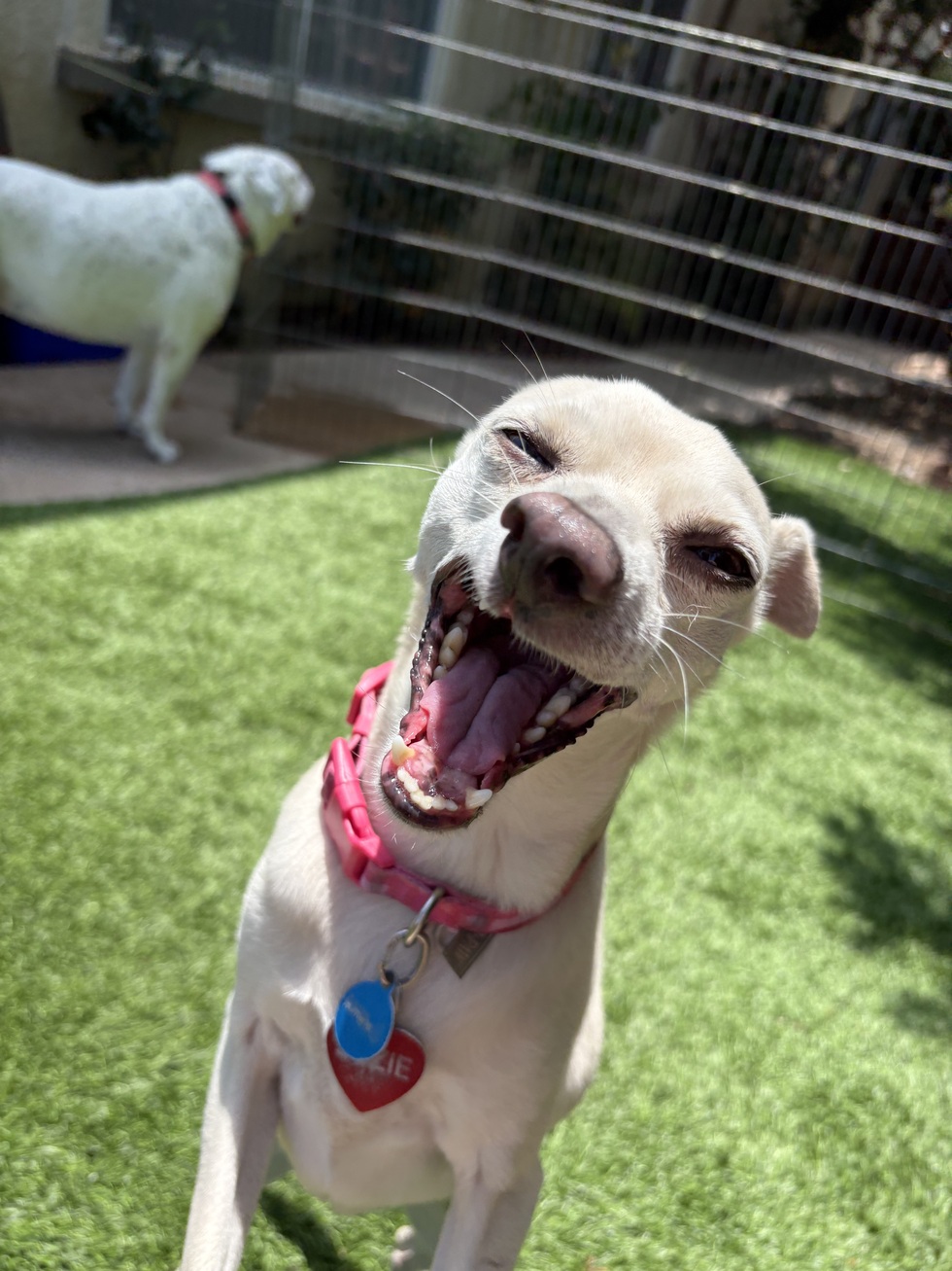 Suzie is an attention hog every second of every day! Mugging for the camera, snuggling up close, and getting in between any other dog getting some one on one attention from a human is her expertise.
