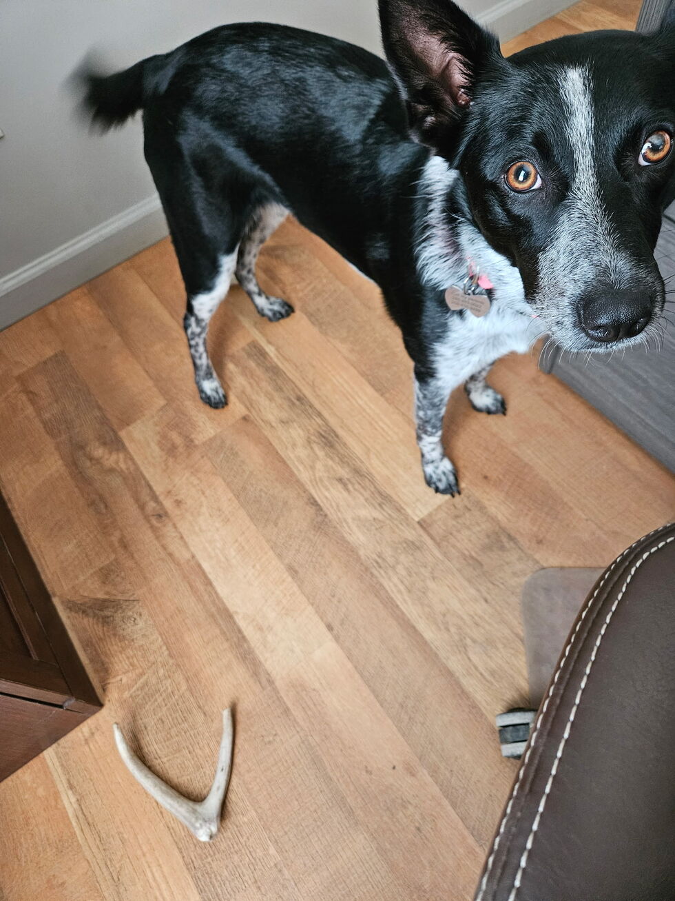 Border collie/blue heeler mix. She is hilarious and sweet all the time. She loves to play ball and throw toys around the house. She never has a bad day. She is the smartest dog we've ever had.