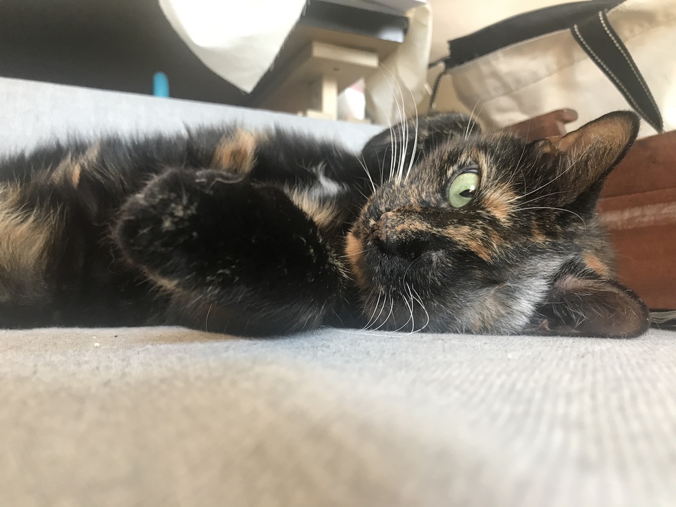 Kat Stratford was brought to Gifford after she was found homeless with two kittens. After the two of them were adopted together from Gifford, she found her forever home at one year old. One year later Kat started chemo for a tumor which stretched from her left eye to the back of her left ear. The day Kat came home from her last radiation treatment her humans got engaged. She loved playing fetch with hair ties and bringing presents to her humans. She especially loved bringing Lindt truffles, little plastic dinosaurs, chocolate Hanukkah gelt, and fitbits. She enjoyed snuggling between one human and his computer when he played video games, and watching her other human play with string. She passed away Thanksgiving day.