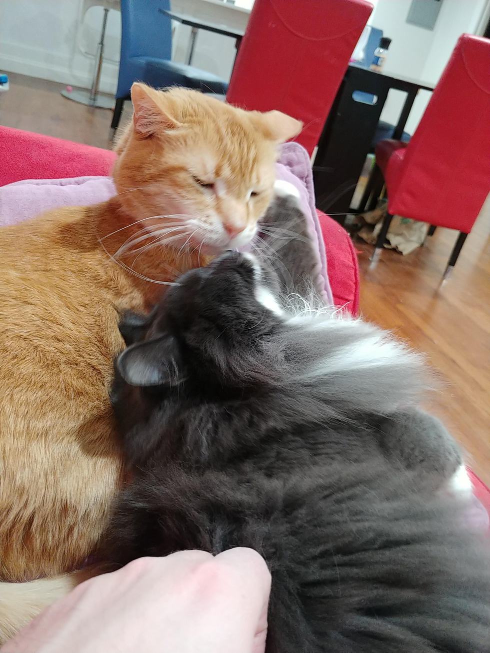 Turing was born in a feral colony ten years ago. Hanna was a frightened stray who made her way into a feral colony, then to Gifford's "Room of Pawsibilities", and finally into our home. The two of them bonded almost immediately and it's hard to tell if this is just a close friendship or if there's romance in the air!
