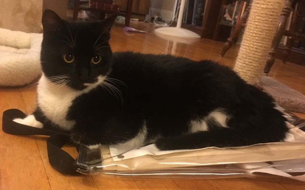 Hi! My name is Winnie. I like keeping my Human from doing her needlepoint. It takes her attention away from me. So I am sitting on her needlepoint bag so that she can't get at it.