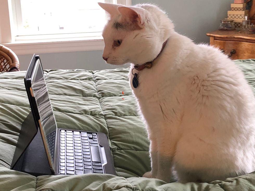 We adopted Madeline from ARL in 2006. She is a snuggle bunny and an intellectual, as evidenced by the photo.