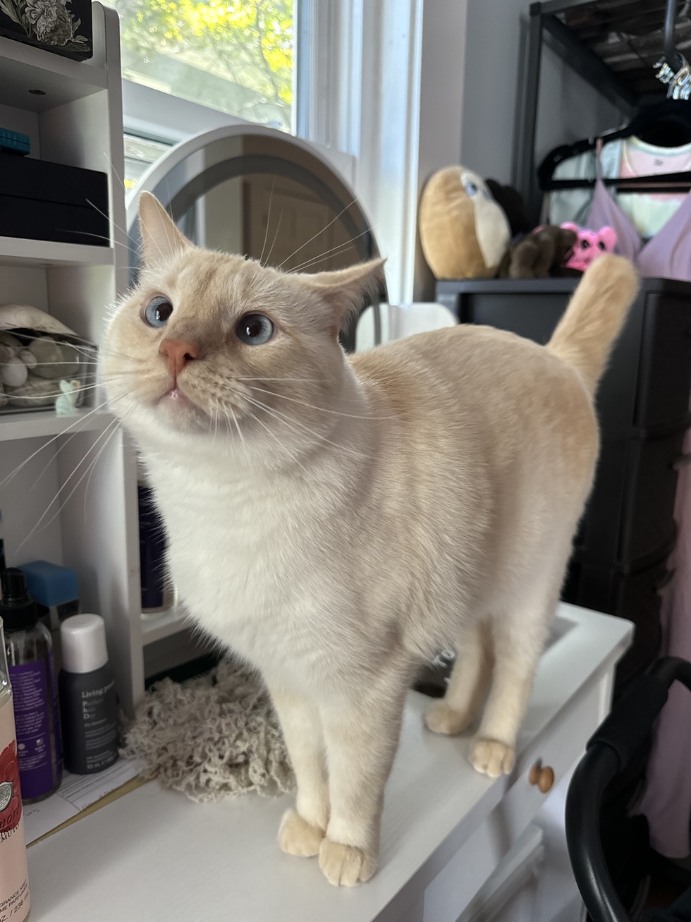 Peachy is a 4 year old boy adopted from Quincy Animal Shelter where I volunteer. He came in to the shelter with a “wound of unknown origin” so had to be with us for a 4 month quarantine. He quickly became a volunteer favorite and I was lucky enough to be able to adopt him in July of 2022. He’s is such a sweet and gentle boy and the best foster uncle when we foster kittens!