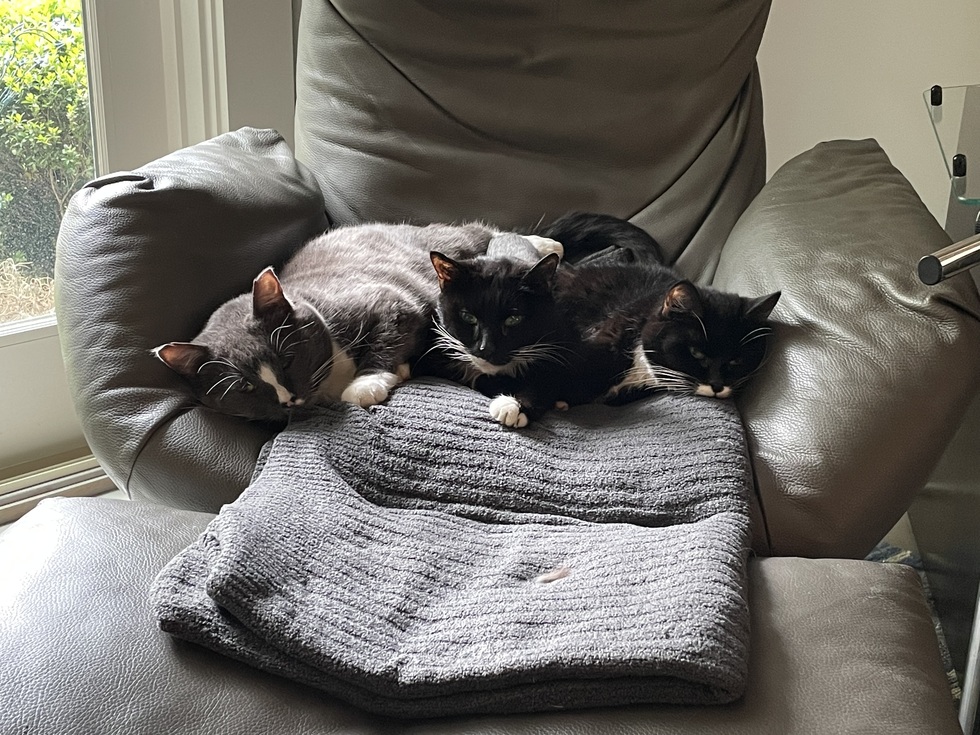 Bob-Bob, Heather, and Savorie were adopted from Gifford cat shelter from the “shy cat room” in September 2019. Heather is Bob-Bob’s girlfriend and Savorie is Heather’s daughter. Heather and Savorie were in the shelter about 8 years before they were adopted. They are the best kitties ever and they love each other so much! They especially like to lounge in the sun on a comfortable chair in their furrrever home!