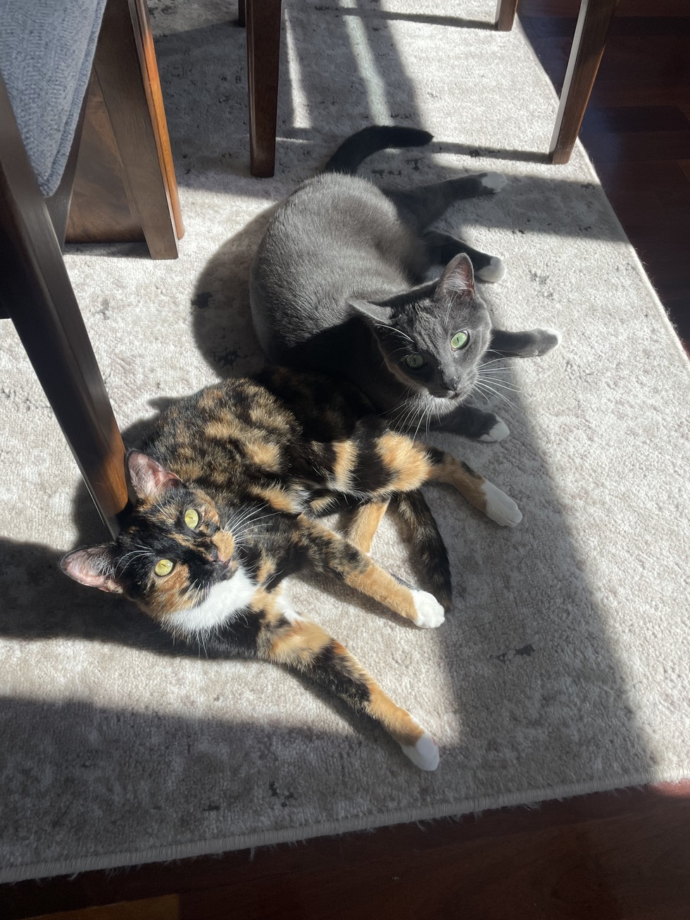 Bonnie (2 yrs old) & Bandit (3 yrs old) are both rescues from New Jersey now living in Boston. But they still have strong opinions about taylor ham and bagels! They both spend their days bird watching, wishing for scrambled eggs, and watching TV on the couch. They love to cuddle!