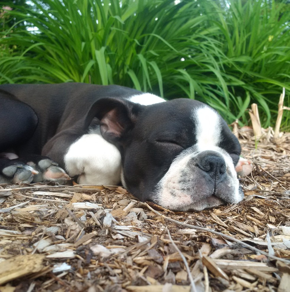 This is Herbs, our 18 week old Boston Terrier. Our cat "Carlos Del-Gato" (Guelph Humane Society Alumni) almost has Herbs completely trained. While Herbs loves to snuggle, ironically his favourite place to relax is in the Herb Garden. Thanks for all the work you do.