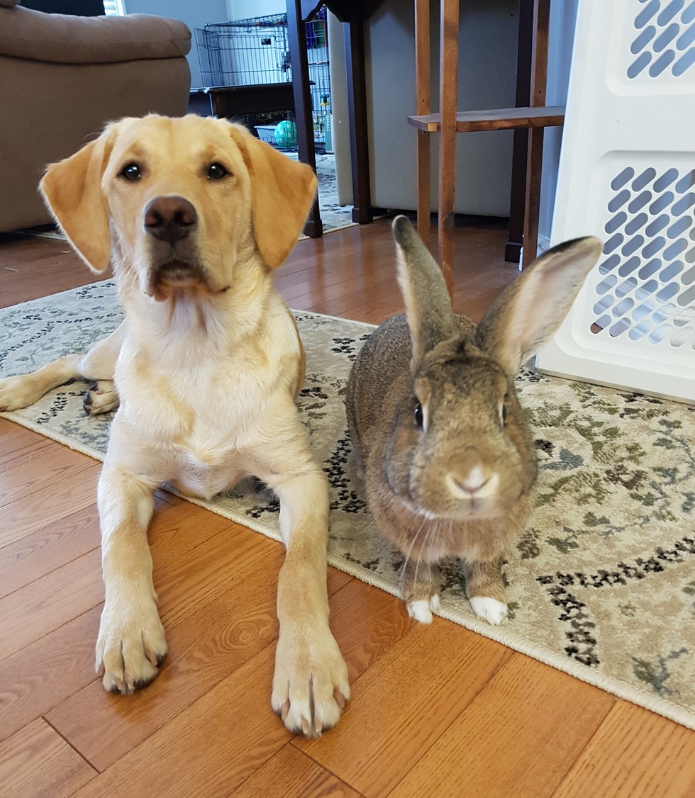 6 month old puppy Molly loves to hang out with her bunny buddy, 3 year old Harvey