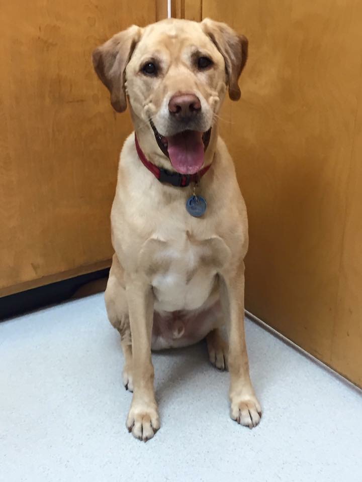 JFSF, a very large yellow Lab, sits and smiles at the vet office awaiting the elusive biscuit.