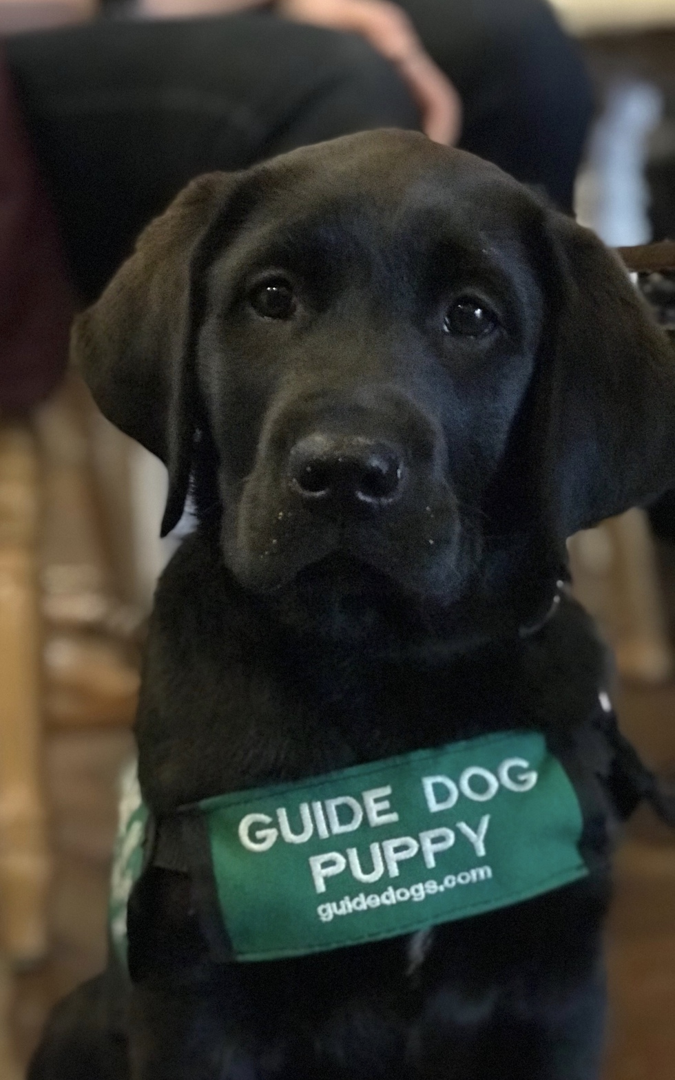 black Lab puppy in training, Aesop, looking dapper in his Sunday best!! He is wearing his green puppy coat.