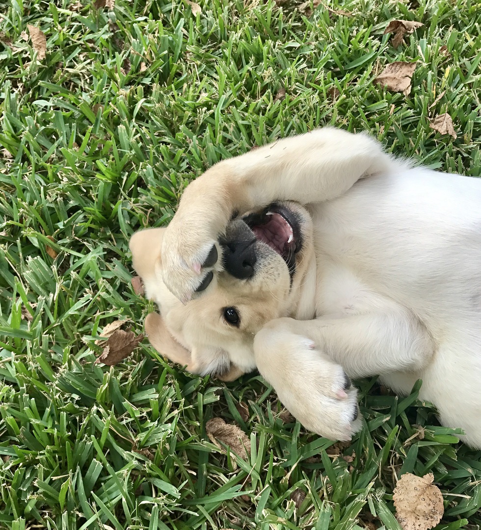Olena, a yellow lab and our first guide dog puppy, smiling while lying in the grass the day we first got her