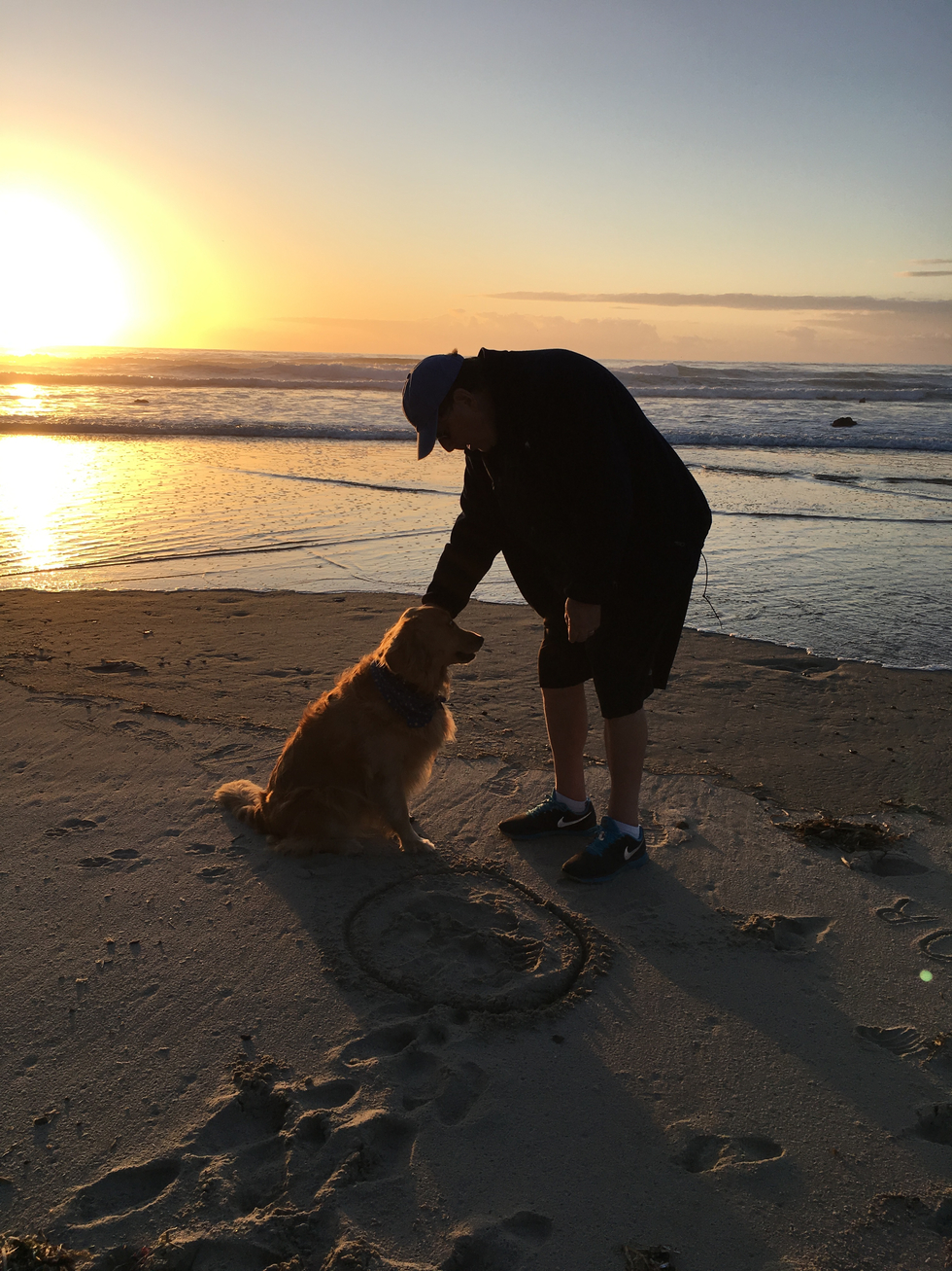 Sharing the sunset on the beach of Neskowin, OR. A man leans down to pet a golden retriever on the beach during sunset.