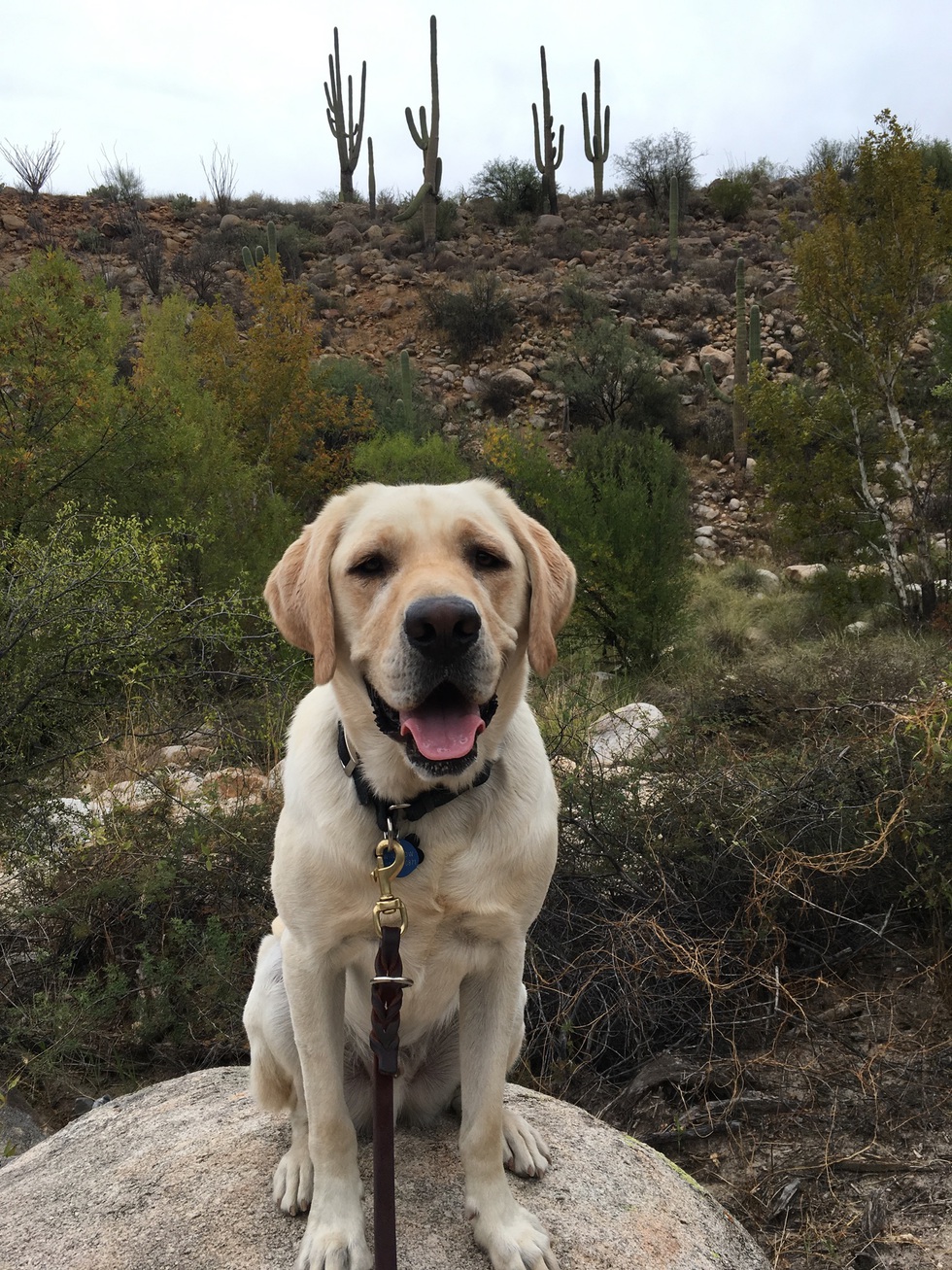 Male yellow lab sitting on a rock in an AZ Park. He is looking at the camera with a big smile on his face. Saguaro cactus are visible behind him.