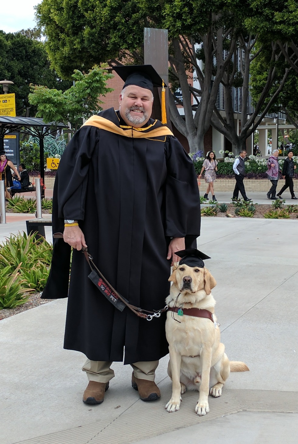 Yellow Lab Irish before Graduation at Cal State Long Beach. Iris stands in a graduation cap next to his handler who is in a graduation gown and cap.