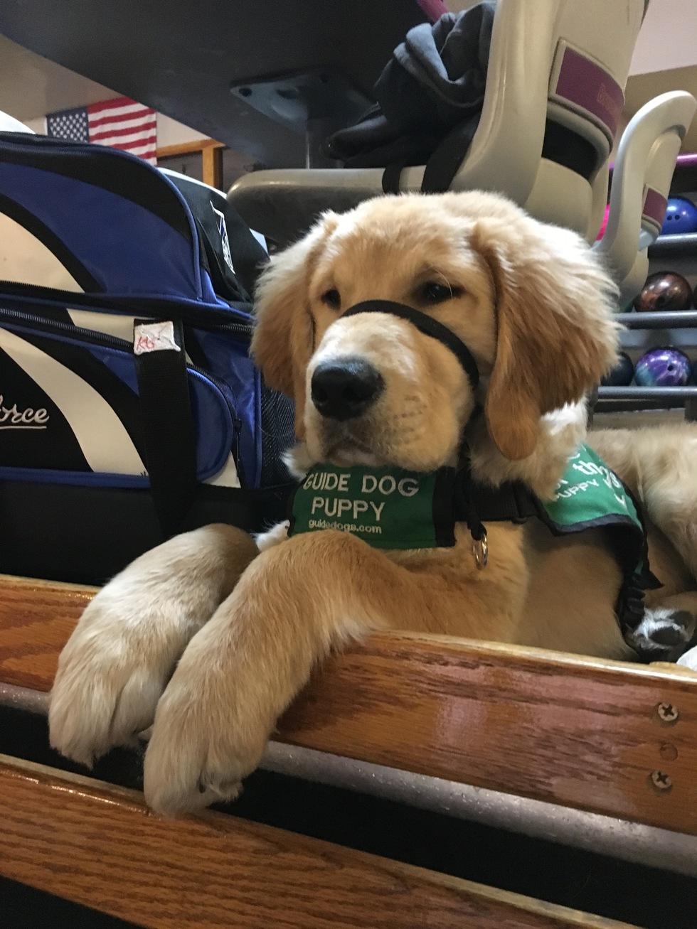 A golden retriever guide dog puppy, Anvil, watches people trying to impress him with their bowling skills at a bowling alley.