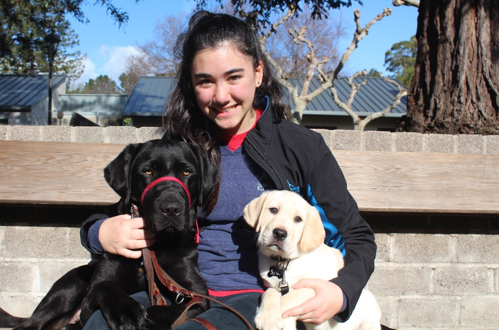 Black Labrador Breeder and yellow Labrador puppy in training sit in female volunteers lap on a bench at the San Rafael campus