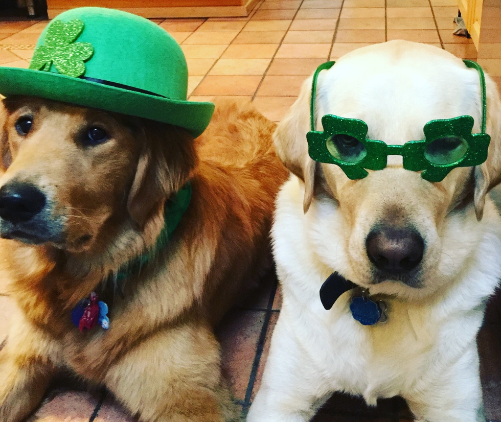 Celebrating St. Paddy’s Day. A golden retriever and yellow Lab wear St Patrick's day attire.
