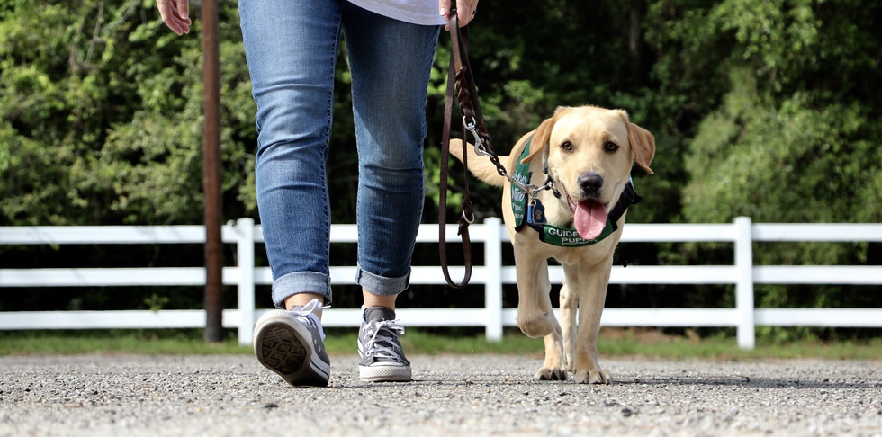 YLF Omega walks next to raiser. She is sticking her tongue out while wearing her GDB green puppy jacket.