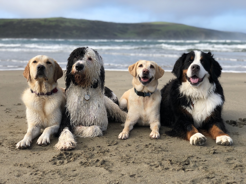 Image descriptionGoose and his three best friends and the beach: Four dogs laying on a sandy beach with the water and mountains behind them out of focus, from left to right in focus there is a Lab Golden Cross, Sheepadoodle, Lab, and Bernese Mountain dog.