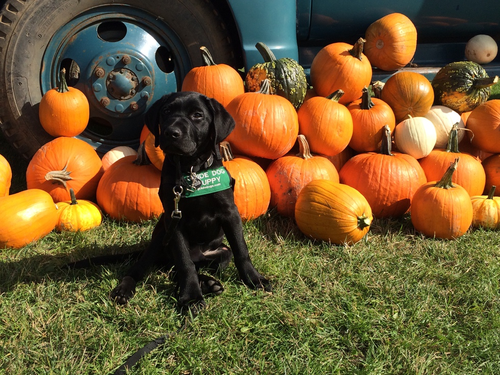 Image descriptionA black Lab guide dog puppy in training sits while basking in the sun in front of a farm truck and a pile of pumpkins. The puppy is wearing a green GDB puppy coat.