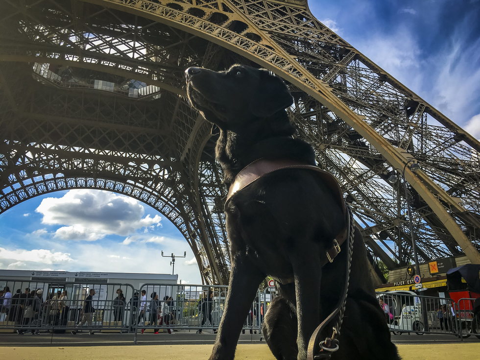 Working black Lab guide dog Camry poses in front of the Eiffel Tower, in Paris, France during a lovely spring day with a bright blue sky and clouds in the background.