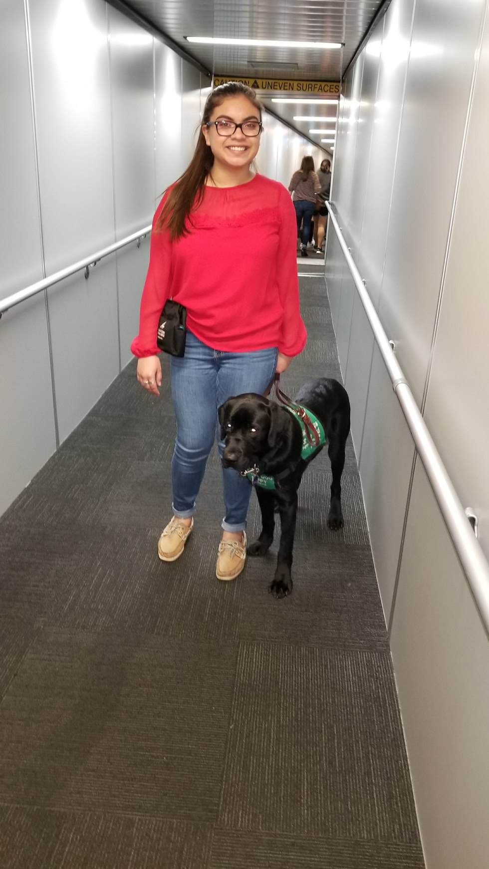 Image descriptionA black Lab guide dog puppy named Whistler stands with his volunteer puppy raiser named June during Airport Training. Whistler is wearing his green GDB puppy coat.