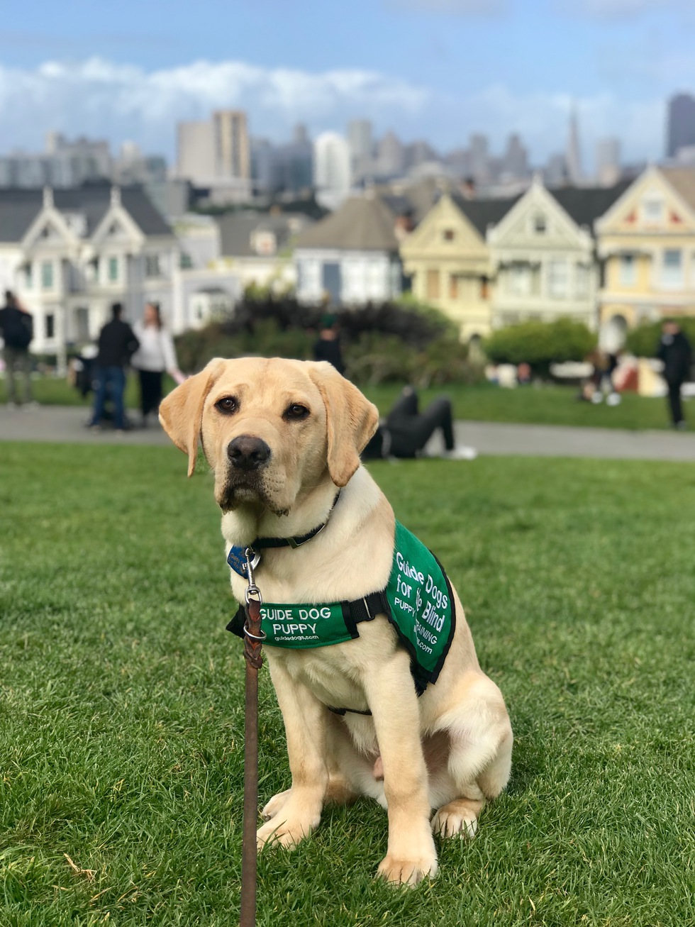 Image descriptionYellow Lab guide dog puppy in training, Lorax, sits on green grass with the San Francisco skyline and "Painted Ladies" (Victorian homes) in the background. Lorax is wearing a green GDB puppy coat.