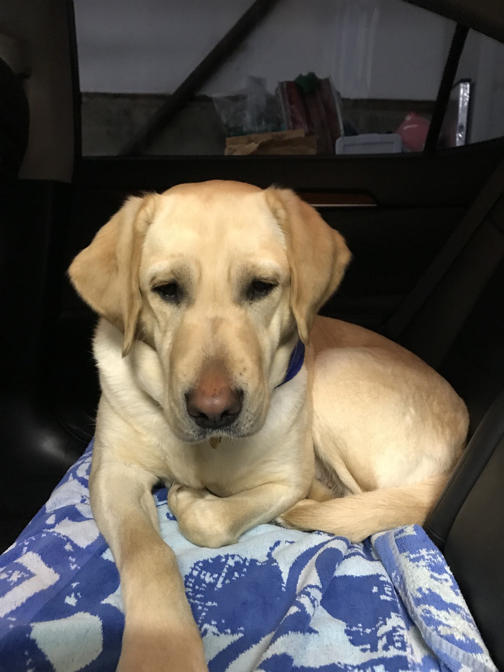 Narnia waiting to go for a ride - a yellow Lab is pictured laying on a blue towel inside a car and gazes below the camera.