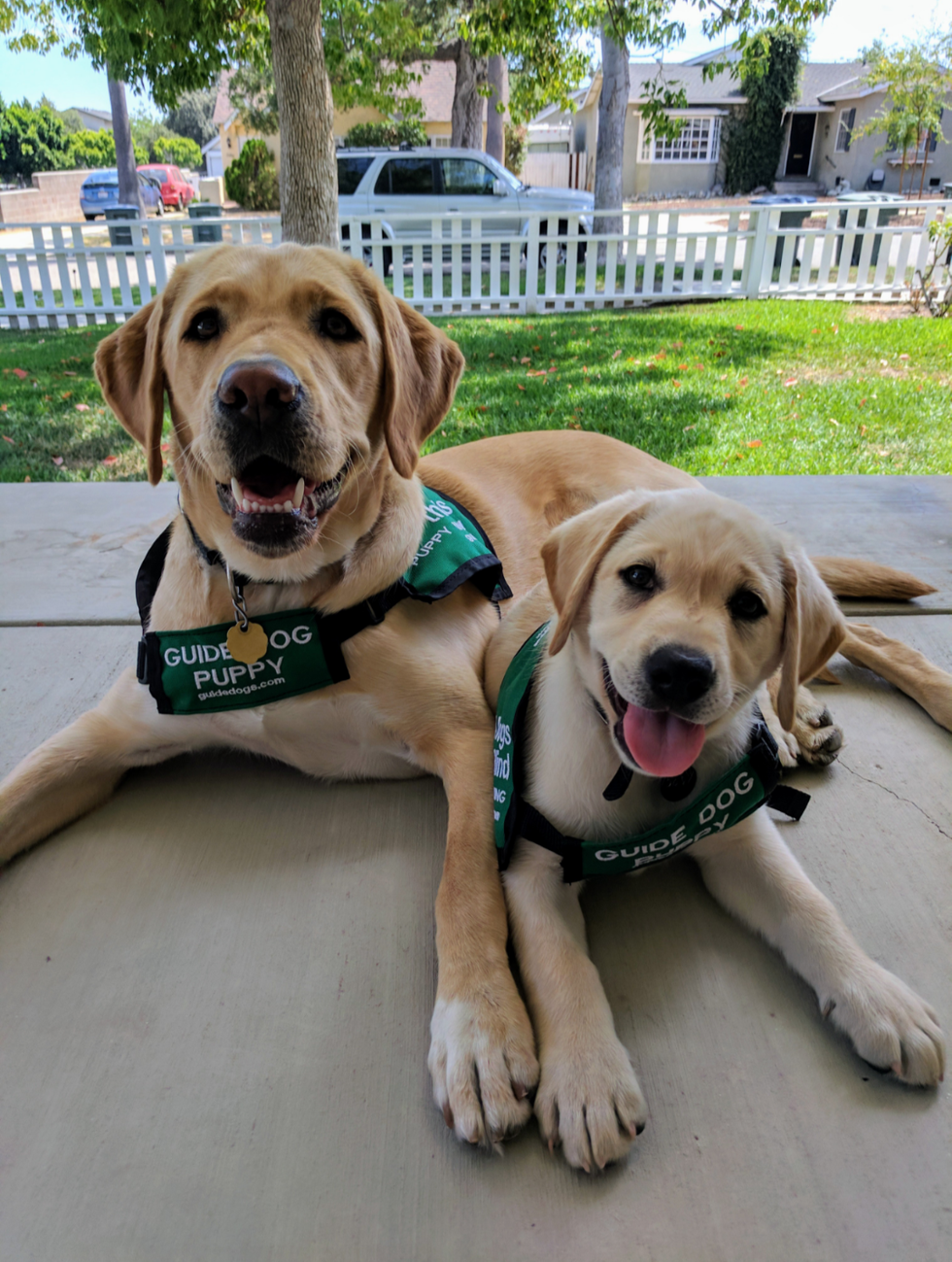 Image descriptionYellow Labs Cinta (on the left) and Frenchy (on the right) lie next to each other on a concrete porch. Both Cinta, 15 months old, and Frenchy, 10 weeks old, are smiling and wearing their green puppy vests. Behind them is grass and a white fence.