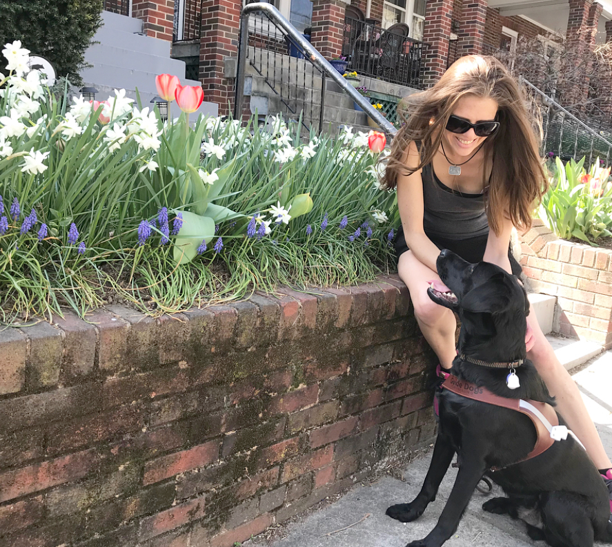 Image descriptionOn a bright spring day, I sit on a brick wall in front of a colorful flowerbed with black Lab Tank sitting at my feet. Tank's Guide Dogs for the Blind harness with logo is showing as we stare lovingly at each other in a moment of mutual adoration.