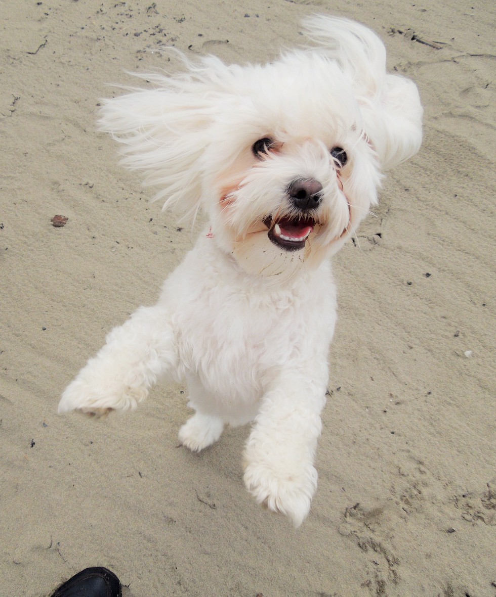 Mickey, my rescue Maltese Bichon, says, "Thank you for bring me to the beach!" (Seaside, Oregon)