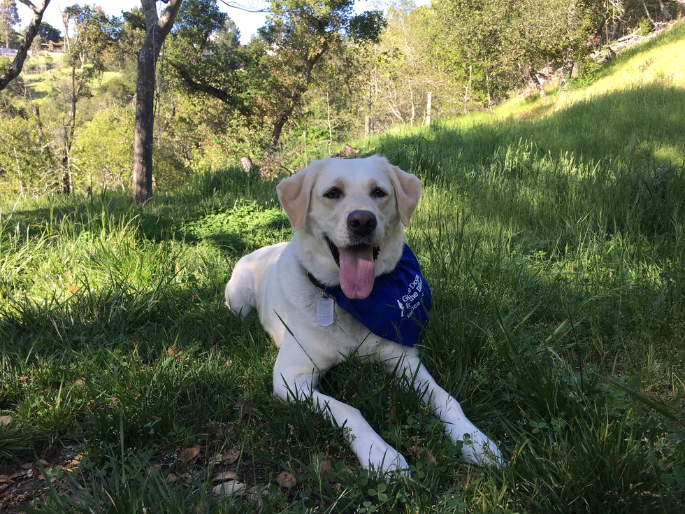 Jordan splendid in the grass. A yellow Lab wears its breeder scarf and lays in some grass.