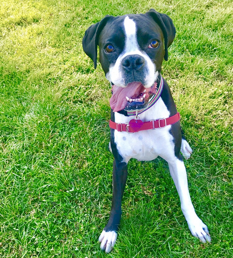 Image descriptionBlack and white Boxer pup named Harley, smiling with excitement to chase her favorite tennis ball at the park! Her Mommy is a GDB volunteer and she is proud to support the Guide Dog family!