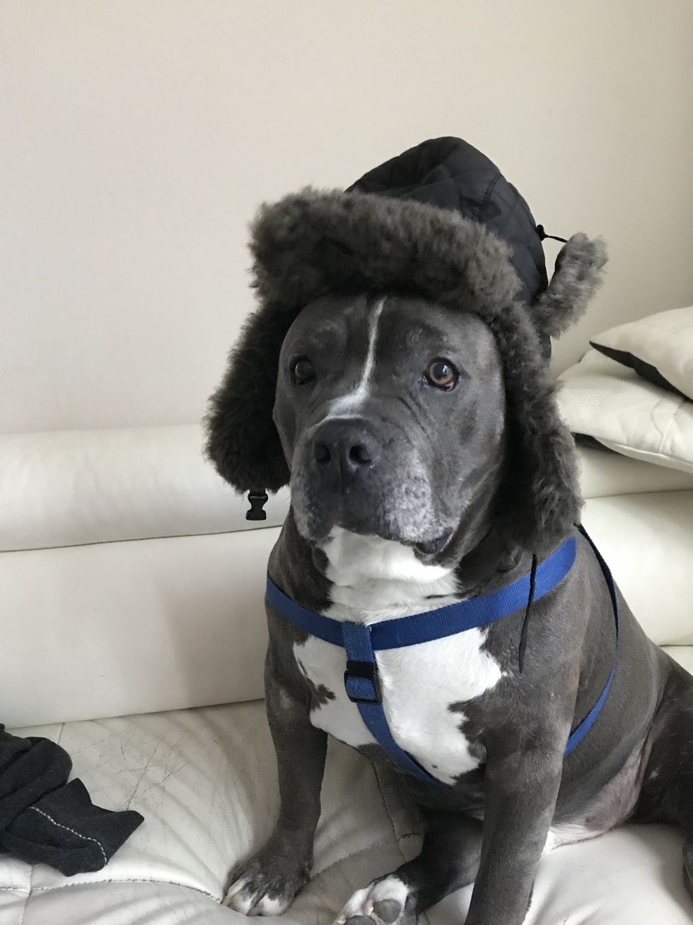 Chillin. A blue pitbull sits down on a couch wearing a warm winter hat.