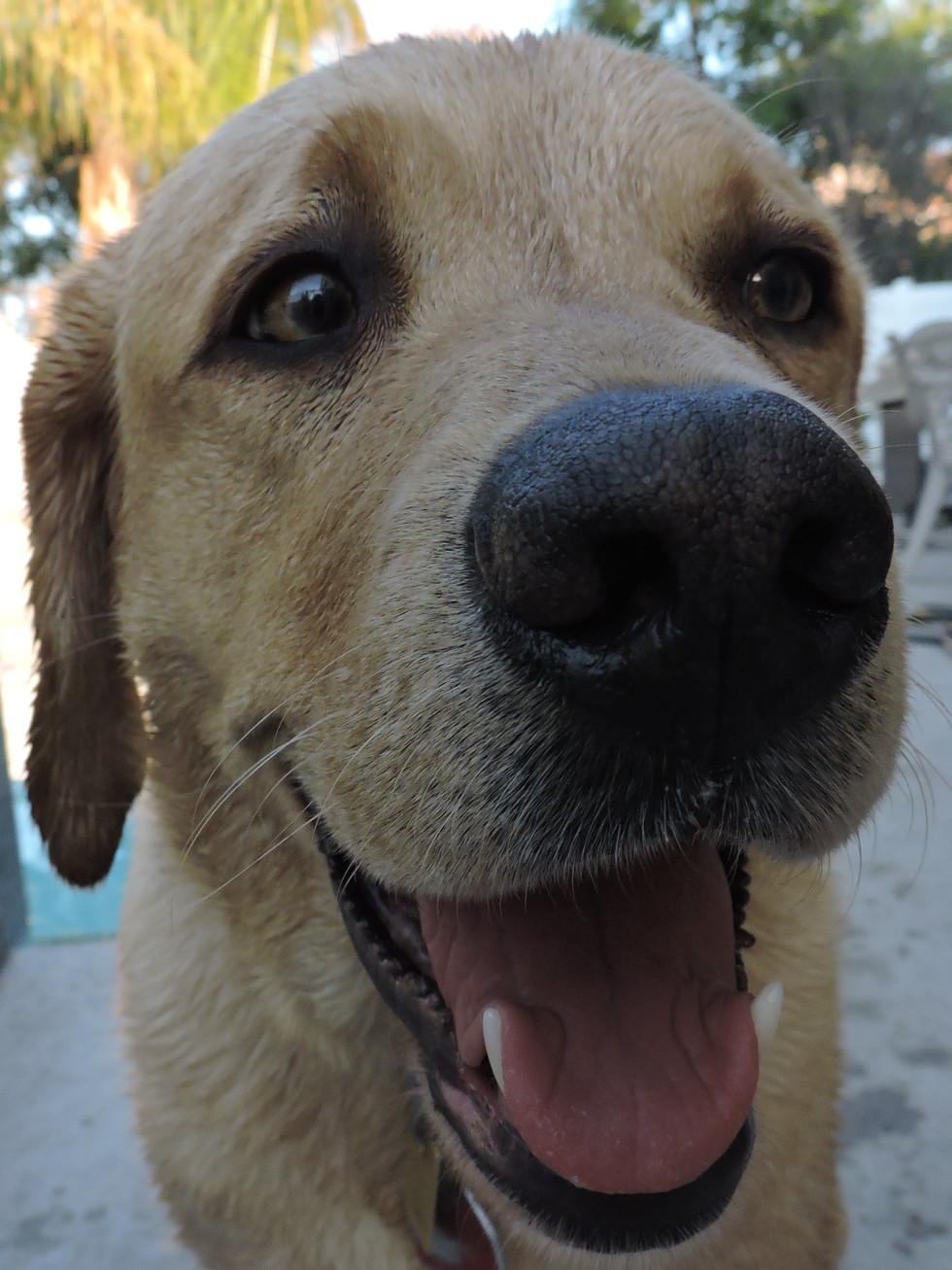 Lassen, a GDB Career Change dog, relaxes after a swim in the pool, seeming to smile.