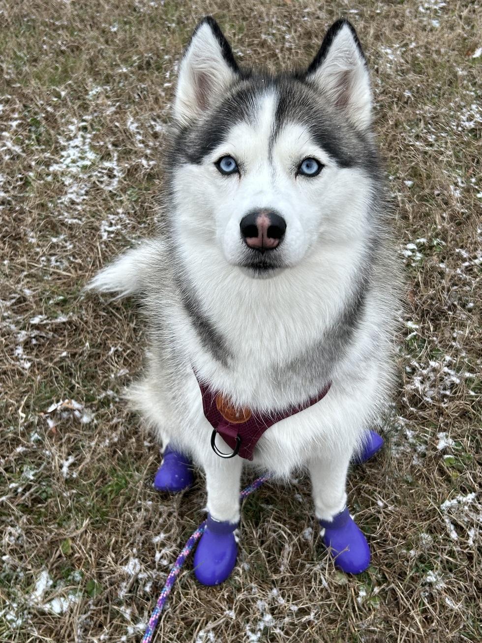 Violet is a three year old blue eyed beauty. She resides in Alexandria, Virginia. Violet is sweet in demeanor, calm in candor and extremely friendly with people and pets! Violet loves freeze dried beef, her Mom, Dad and her rope toys. When her parents get home she straps up her boots and hits the road for long walks, fast runs and fun outdoors!