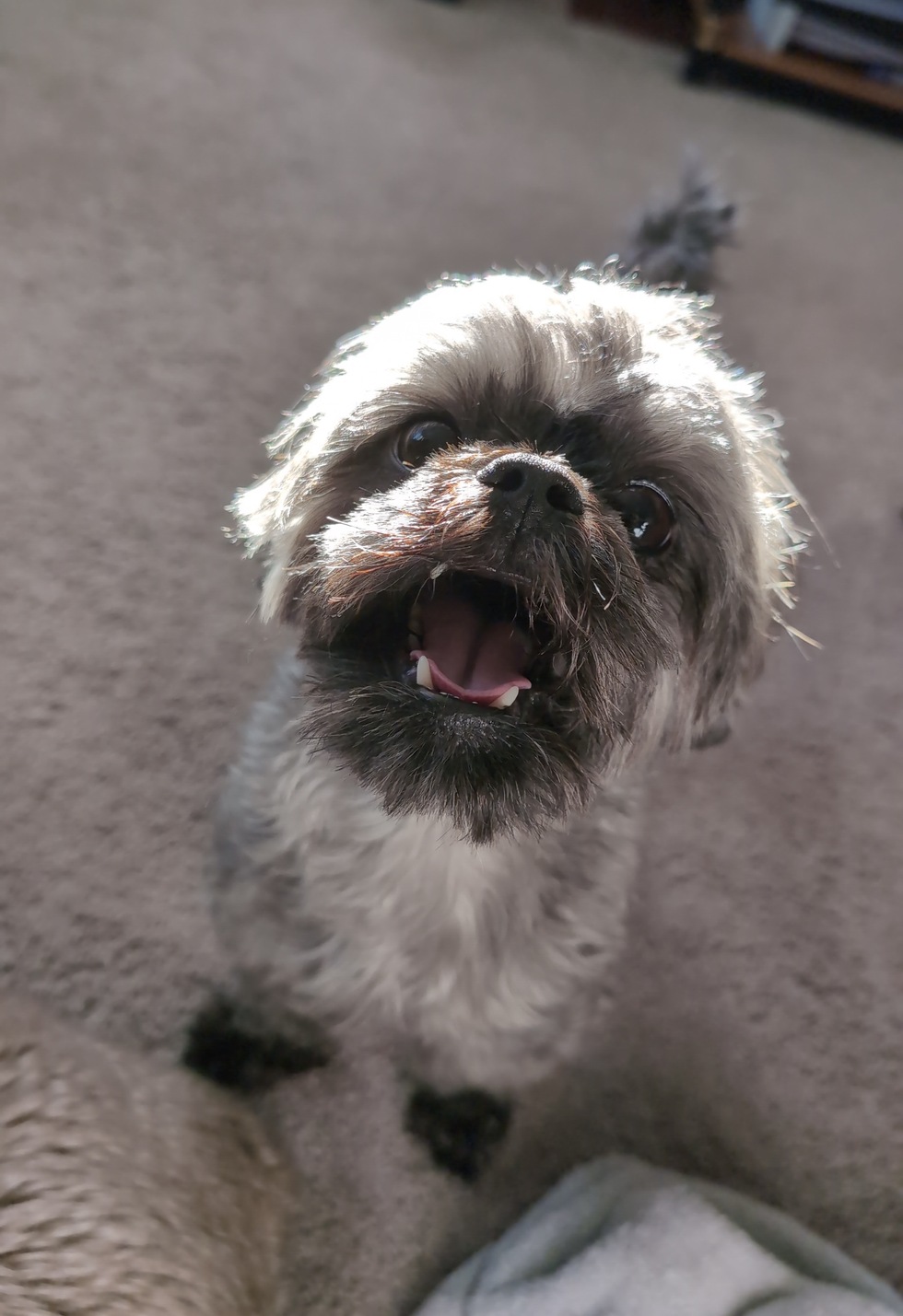 Monte is a handsome gray Shihpoo, is incredibly energetic, goofy, and loves to run.