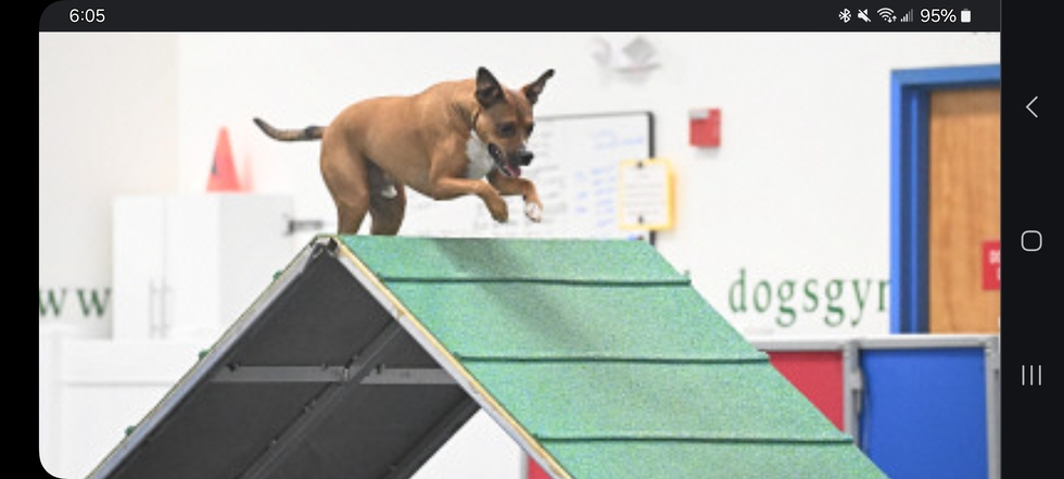 On our very first day of volunteering, this amazing pup got loose and ran across a parking lot. Thankfully a woman across the way saw and quickly took her scarf off and snagged him. He later became our pup permanently and now runs like a mad dog on the agility course.