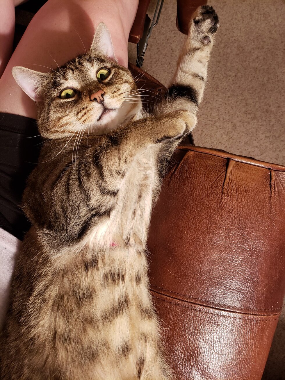 Brown/gray tiger. Very friendly. Loves belly rubs and is leaning to be a camper cat.