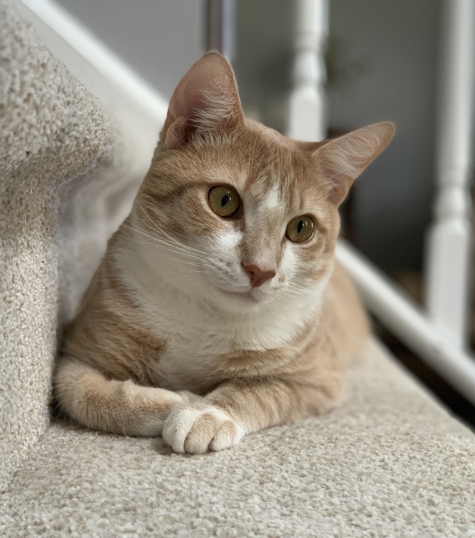 Meet Melman (formerly Elliot)! Melman was the last of his sibling group of four to be adopted and looked quite strange when he was small. At a year old, Melman has grown into his ears and nose and is now one handsome devil! Melman is incredibly vocal and loves helping out in the kitchen. His other passions include naps on the stairs, hanging with his dog brother, and playing with his cat sister. Melman loves that his parents work from home and has made a lot of Zoom appearances recently. He is never shy and always willing to hang out.