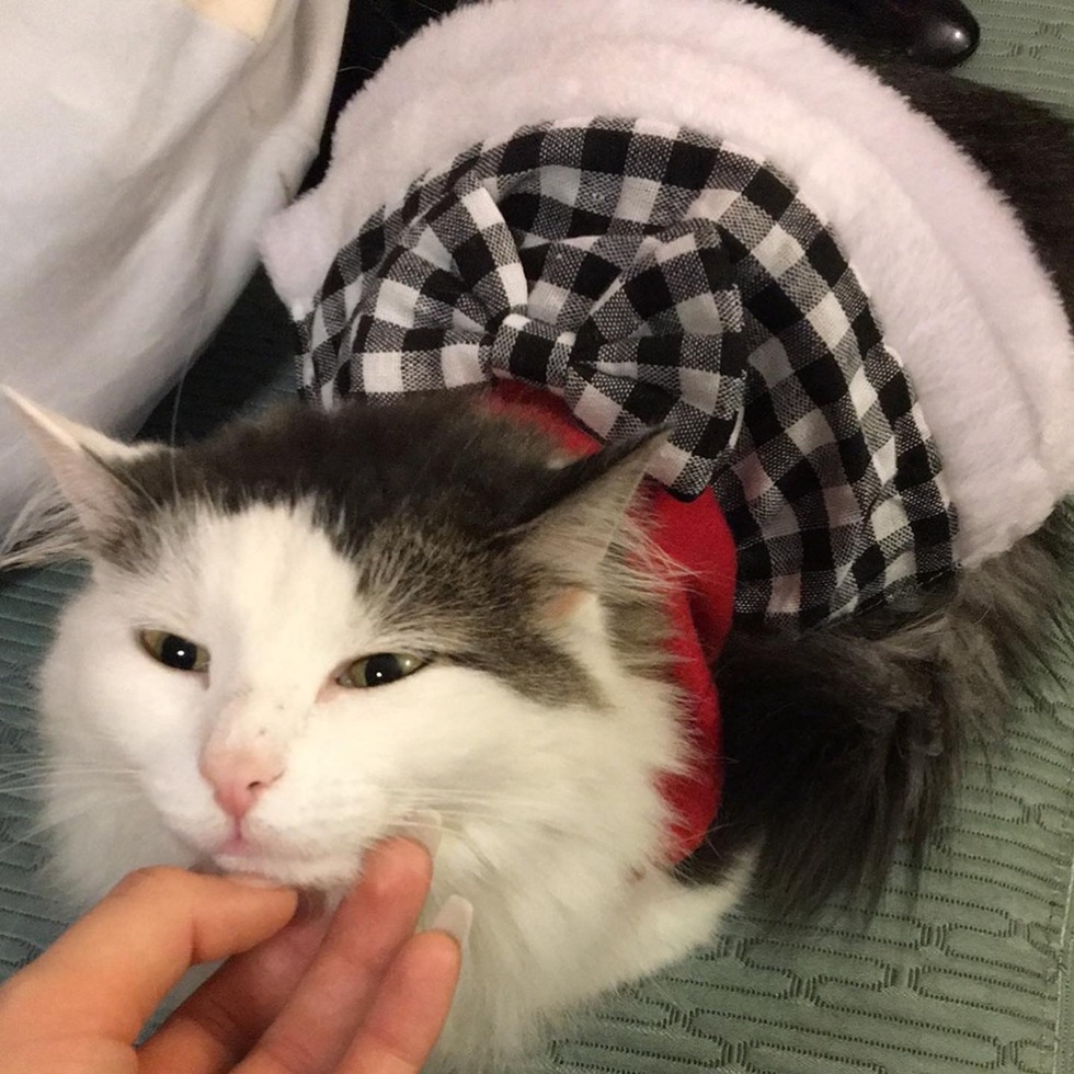 MeMow is a fluffy Christmas assassin! She lives for this cozy time of year, to her it’s a time of dazzling lights, indoor trees and toys! (ornaments she knocks off the tree) Don’t let her fool you though, she not much of a gift giver, unless it’s kisses of course.