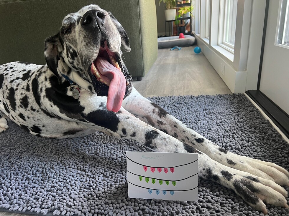 When I first met Maxwell at the Highland Humane Society in August 2023, he had just been surrendered and was in pretty rough shape. A middle-aged Great Dane with a hard past, he looked so sad that I knew I had to help. Thanks to the dedicated staff at the Humane Society, Maxwell was nursed back to health. He’s been a beloved member of our family since December 2023. This photo was taken on our one-year “Gotcha Day” anniversary.