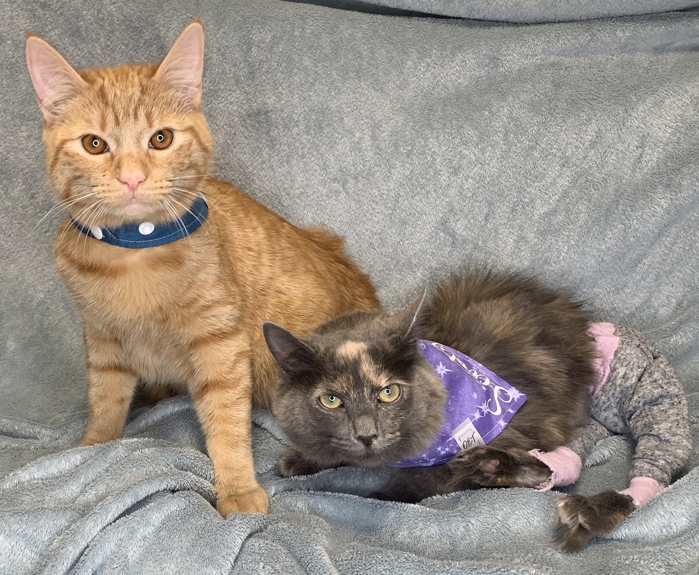 Scooty is the prettiest dilute tortie who was found with her brother Piggy. Scooty is paralyzed in her hind legs and wears the cutest pants to keep her little diaper on. She requires a lot of love and care and gets manually expressed a few times a day to go to the bathroom. She can’t walk but that certainly doesn’t stop her from living her best life! She climbs and jumps and zooms around the house just like all of the other kitties! She would love to show everyone that special needs kitties are totally worthy of love!
