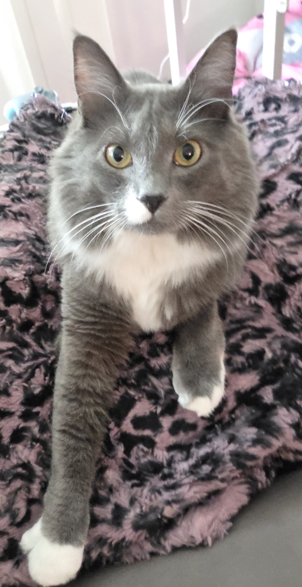 Miles is a tripaw, and was found by a kind samaritan, behind a dumpster with his rear leg broken in 2 places; we adopted him 2wks post-op. We're so grateful for this little fluffball, and have loved watching/cheering for him while he regained confidence in jumping and moving around on his 3 legs. He's our little shadow and loves cuddling up on our laps or back of our couch, and even burrows under blankets next to us.